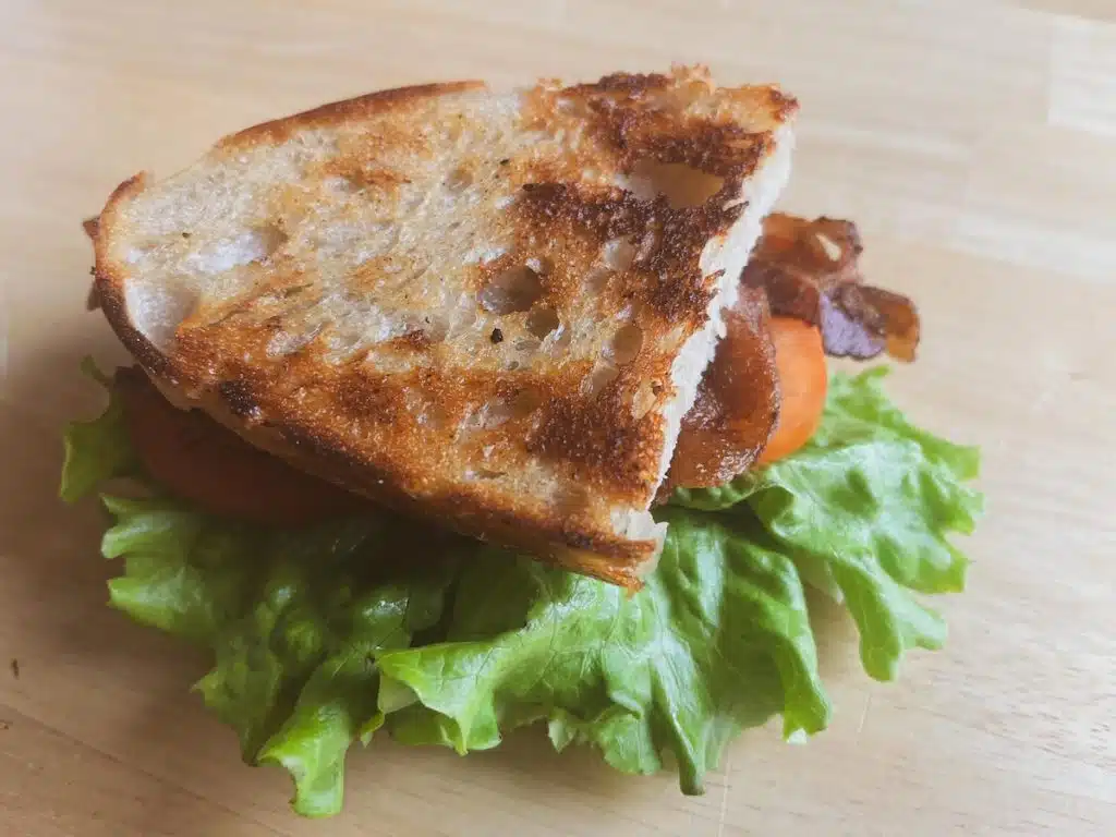 We just had this last night and it was oh so good! Toast two slices of sourdough bread (toasting is a must!), add some homemade mayo, tomato slices, bacon, and leaf lettuce. I had baked the sourdough fresh that day, so you can imagine how good this was!